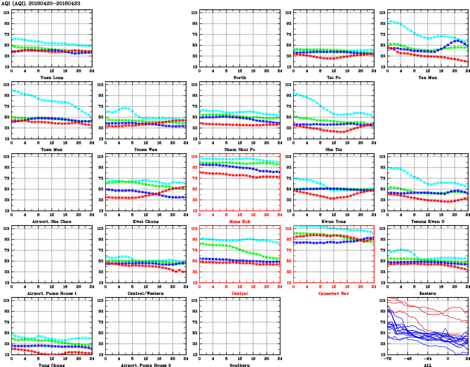| Air Quality Data Time Series for AQI (2018/04/23) | ( Line colors: Day -3 Day -2 Day -1 Current day ) | 2D Map Current AQHI |
