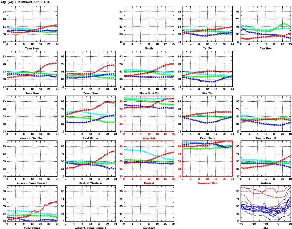 | Air Quality Data Time Series for AQI (2018/04/24) | ( Line colors: Day -3 Day -2 Day -1 Current day ) | 2D Map Current AQHI |
