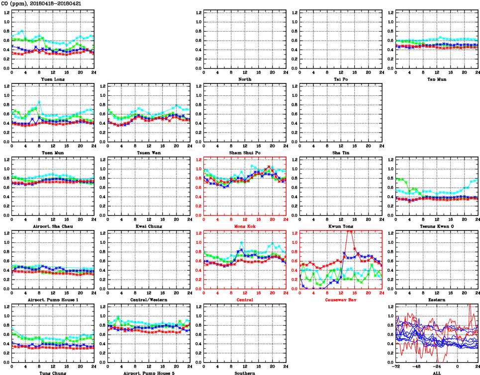 | Air Quality Data Time Series for CO (2018/04/21) | ( Line colors: Day -3 Day -2 Day -1 Current day ) | 2D Map Current AQHI |