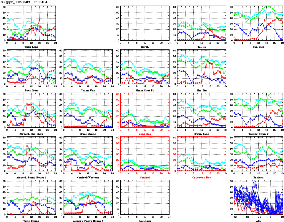 | Air Quality Data Time Series for O3 (2018/04/24) | ( Line colors: Day -3 Day -2 Day -1 Current day ) | 2D Map Current AQHI |