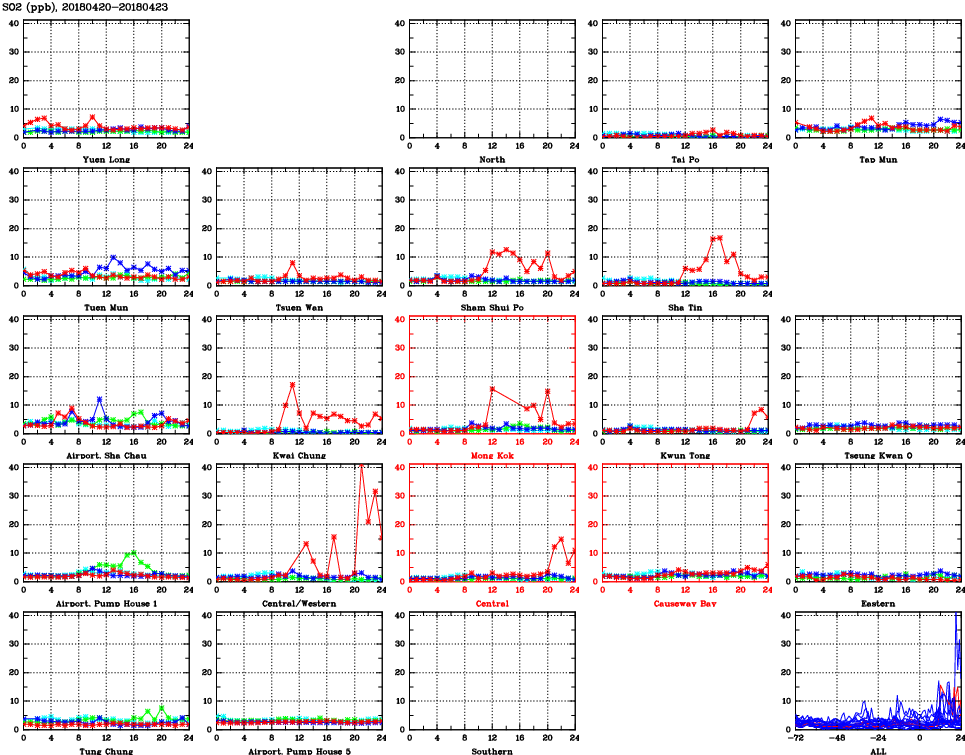 | Air Quality Data Time Series for SO2 (2018/04/23) | ( Line colors: Day -3 Day -2 Day -1 Current day ) | 2D Map Current AQHI |
