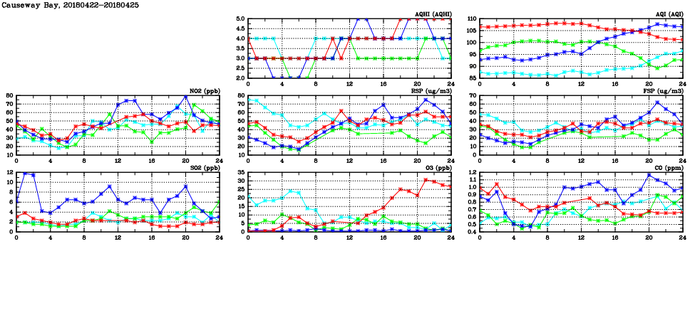 | Air Quality Data Time Series in Causeway Bay (2018/04/25) | ( Line colors: Day -3 Day -2 Day -1 Current day ) | 2D Map Current AQHI |
