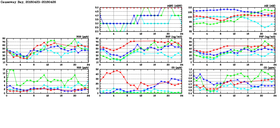 | Air Quality Data Time Series in Causeway Bay (2018/04/26) | ( Line colors: Day -3 Day -2 Day -1 Current day ) | 2D Map Current AQHI |