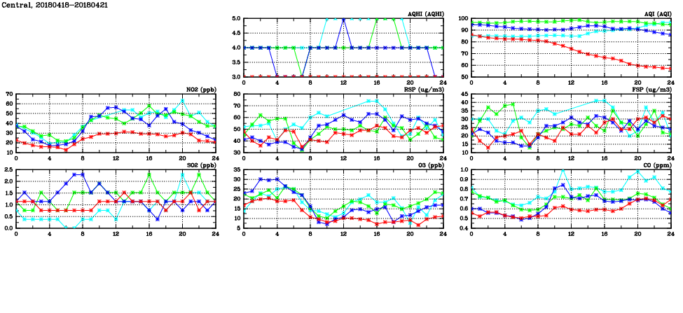| Air Quality Data Time Series in Central (2018/04/21) | ( Line colors: Day -3 Day -2 Day -1 Current day ) | 2D Map Current AQHI |