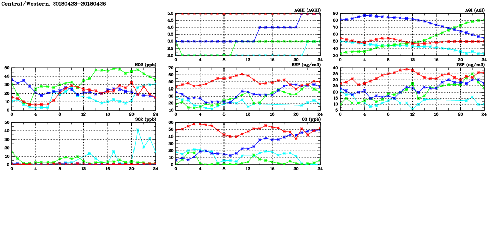 | Air Quality Data Time Series in Central/Western (2018/04/26) | ( Line colors: Day -3 Day -2 Day -1 Current day ) | 2D Map Current AQHI |
