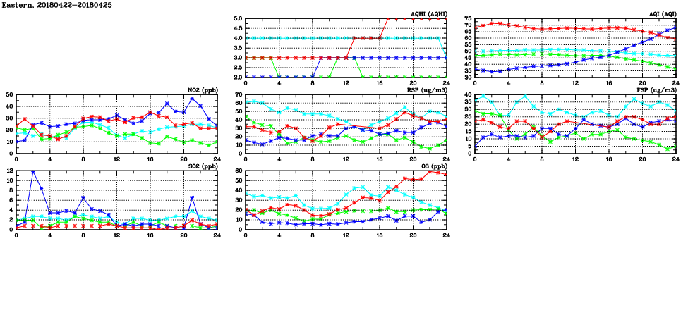 | Air Quality Data Time Series in Eastern (2018/04/25) | ( Line colors: Day -3 Day -2 Day -1 Current day ) | 2D Map Current AQHI |