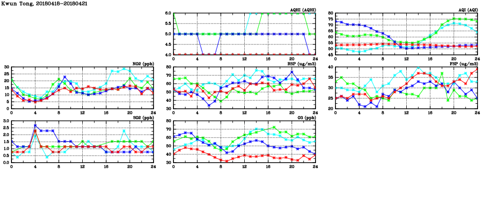 | Air Quality Data Time Series in Kwun Tong (2018/04/21) | ( Line colors: Day -3 Day -2 Day -1 Current day ) | 2D Map Current AQHI |