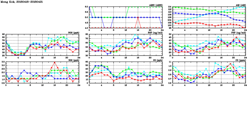 | Air Quality Data Time Series in Mong Kok (2018/04/21) | ( Line colors: Day -3 Day -2 Day -1 Current day ) | 2D Map Current AQHI |