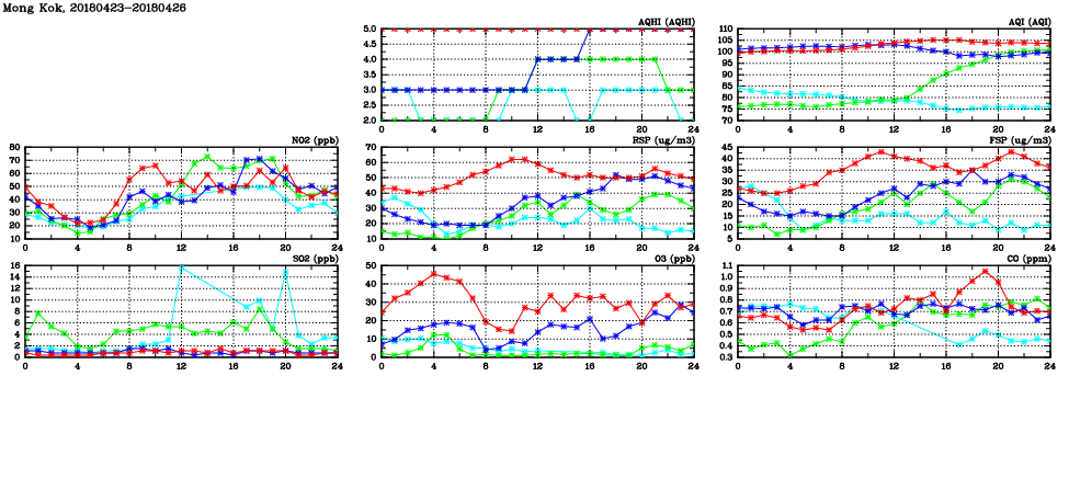 | Air Quality Data Time Series in Mong Kok (2018/04/26) | ( Line colors: Day -3 Day -2 Day -1 Current day ) | 2D Map Current AQHI |