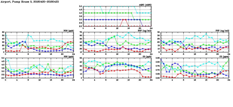 | Air Quality Data Time Series in Airport, Pump House 5 (2018/04/23) | ( Line colors: Day -3 Day -2 Day -1 Current day ) | 2D Map Current AQHI |