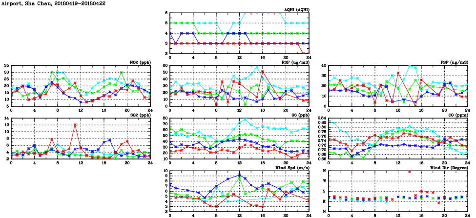 | Air Quality Data Time Series in Airport, Sha Chau (2018/04/22) | ( Line colors: Day -3 Day -2 Day -1 Current day ) | 2D Map Current AQHI |