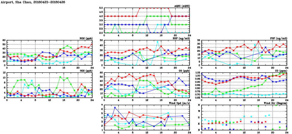 | Air Quality Data Time Series in Airport, Sha Chau (2018/04/26) | ( Line colors: Day -3 Day -2 Day -1 Current day ) | 2D Map Current AQHI |