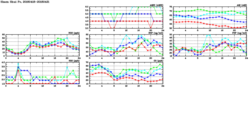 | Air Quality Data Time Series in Sham Shui Po (2018/04/21) | ( Line colors: Day -3 Day -2 Day -1 Current day ) | 2D Map Current AQHI |