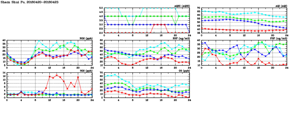 | Air Quality Data Time Series in Sham Shui Po (2018/04/23) | ( Line colors: Day -3 Day -2 Day -1 Current day ) | 2D Map Current AQHI |