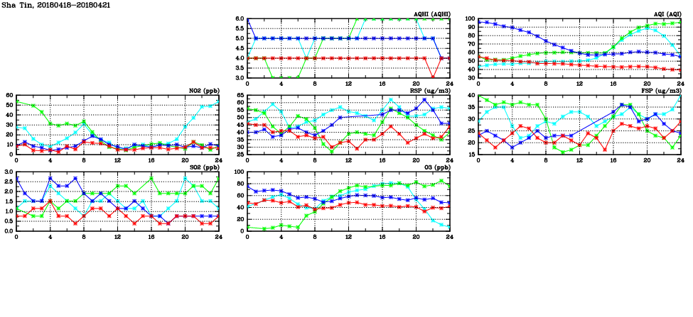 | Air Quality Data Time Series in Sha Tin (2018/04/21) | ( Line colors: Day -3 Day -2 Day -1 Current day ) | 2D Map Current AQHI |