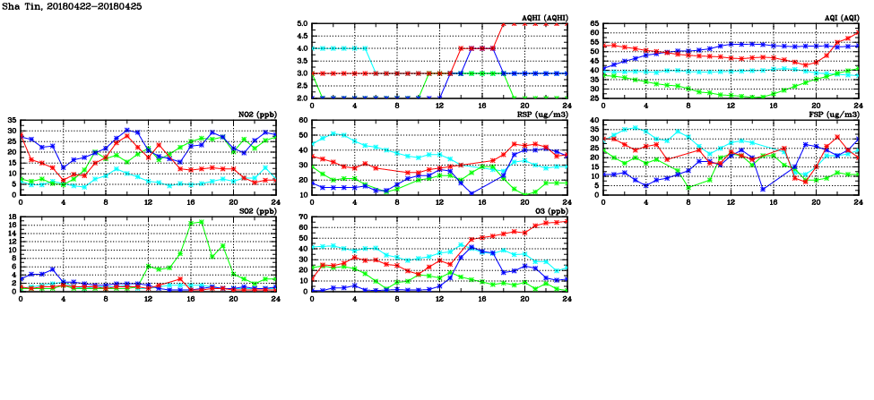 | Air Quality Data Time Series in Sha Tin (2018/04/25) | ( Line colors: Day -3 Day -2 Day -1 Current day ) | 2D Map Current AQHI |
