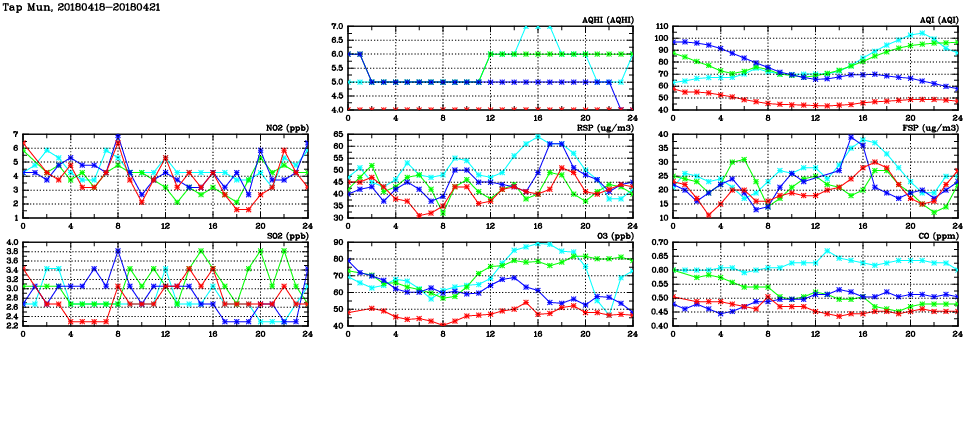 | Air Quality Data Time Series in Tap Mun (2018/04/21) | ( Line colors: Day -3 Day -2 Day -1 Current day ) | 2D Map Current AQHI |