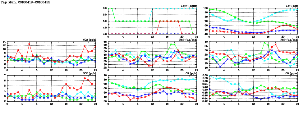 | Air Quality Data Time Series in Tap Mun (2018/04/22) | ( Line colors: Day -3 Day -2 Day -1 Current day ) | 2D Map Current AQHI |