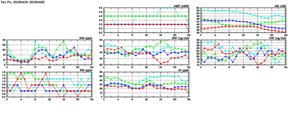 | Air Quality Data Time Series in Tai Po (2018/04/22) | ( Line colors: Day -3 Day -2 Day -1 Current day ) | 2D Map Current AQHI |