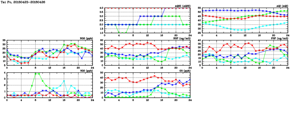 | Air Quality Data Time Series in Tai Po (2018/04/26) | ( Line colors: Day -3 Day -2 Day -1 Current day ) | 2D Map Current AQHI |