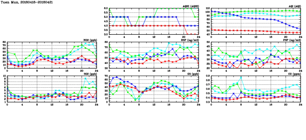 | Air Quality Data Time Series in Tuen Mun (2018/04/21) | ( Line colors: Day -3 Day -2 Day -1 Current day ) | 2D Map Current AQHI |