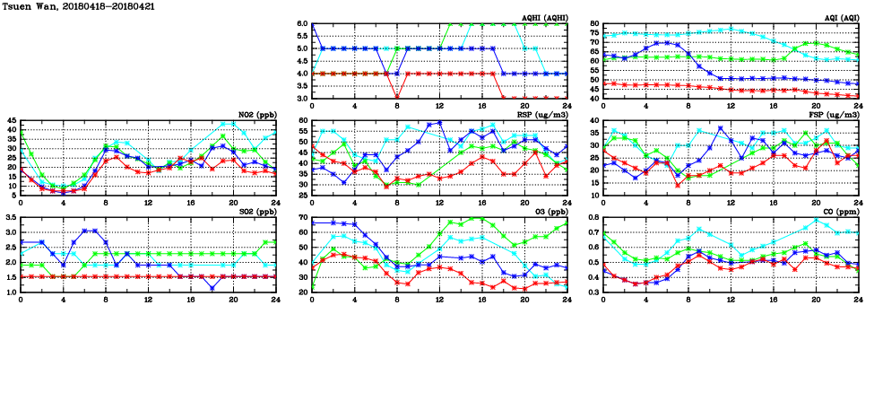 | Air Quality Data Time Series in Tsuen Wan (2018/04/21) | ( Line colors: Day -3 Day -2 Day -1 Current day ) | 2D Map Current AQHI |