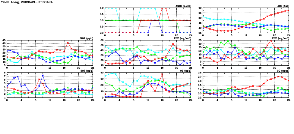 | Air Quality Data Time Series in Yuen Long (2018/04/24) | ( Line colors: Day -3 Day -2 Day -1 Current day ) | 2D Map Current AQHI |