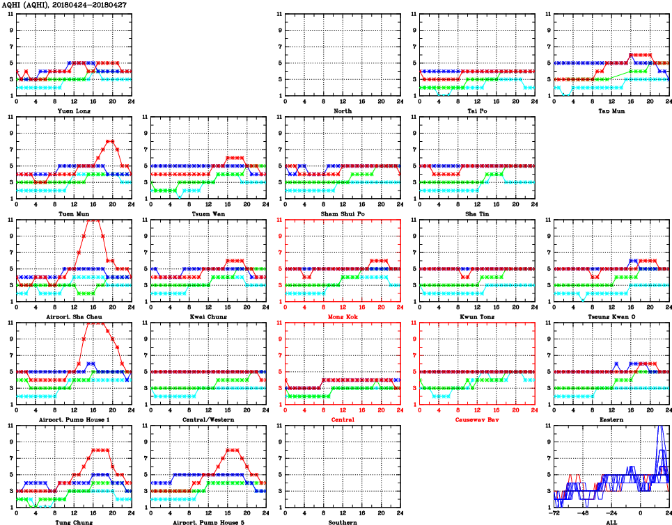 | Air Quality Data Time Series for AQHI (2018/04/27) | ( Line colors: Day -3 Day -2 Day -1 Current day ) | 2D Map Current AQHI |
