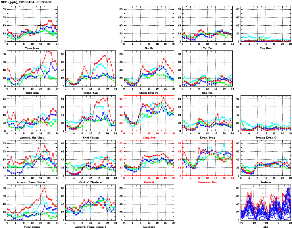 | Air Quality Data Time Series for NO2 (2018/04/27) | ( Line colors: Day -3 Day -2 Day -1 Current day ) | 2D Map Current AQHI |