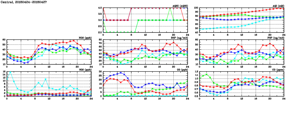 | Air Quality Data Time Series in Central (2018/04/27) | ( Line colors: Day -3 Day -2 Day -1 Current day ) | 2D Map Current AQHI |