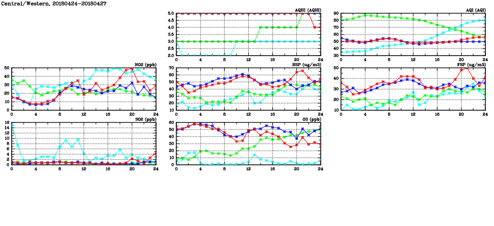 | Air Quality Data Time Series in Central/Western (2018/04/27) | ( Line colors: Day -3 Day -2 Day -1 Current day ) | 2D Map Current AQHI |