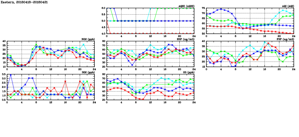 | Air Quality Data Time Series in Eastern (2018/04/21) | ( Line colors: Day -3 Day -2 Day -1 Current day ) | 2D Map Current AQHI |