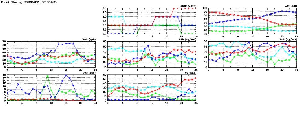 | Air Quality Data Time Series in Kwai Chung (2018/04/25) | ( Line colors: Day -3 Day -2 Day -1 Current day ) | 2D Map Current AQHI |