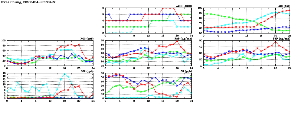 | Air Quality Data Time Series in Kwai Chung (2018/04/27) | ( Line colors: Day -3 Day -2 Day -1 Current day ) | 2D Map Current AQHI |