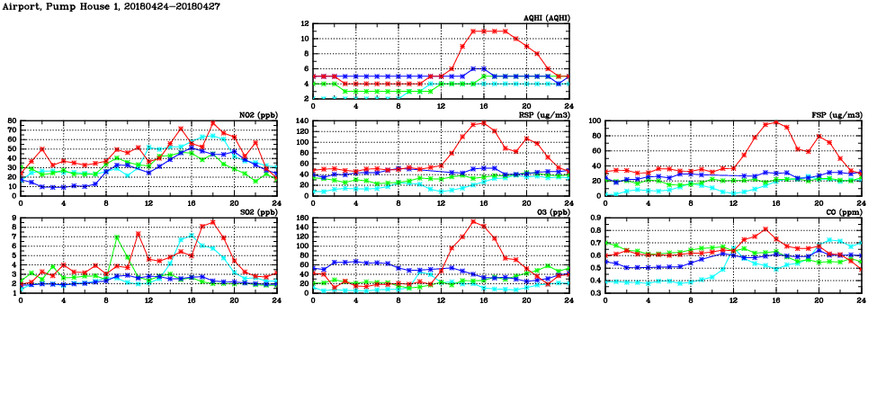 | Air Quality Data Time Series in Airport, Pump House 1 (2018/04/27) | ( Line colors: Day -3 Day -2 Day -1 Current day ) | 2D Map Current AQHI |