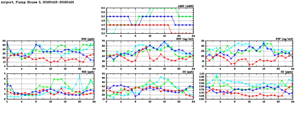 | Air Quality Data Time Series in Airport, Pump House 5 (2018/04/21) | ( Line colors: Day -3 Day -2 Day -1 Current day ) | 2D Map Current AQHI |