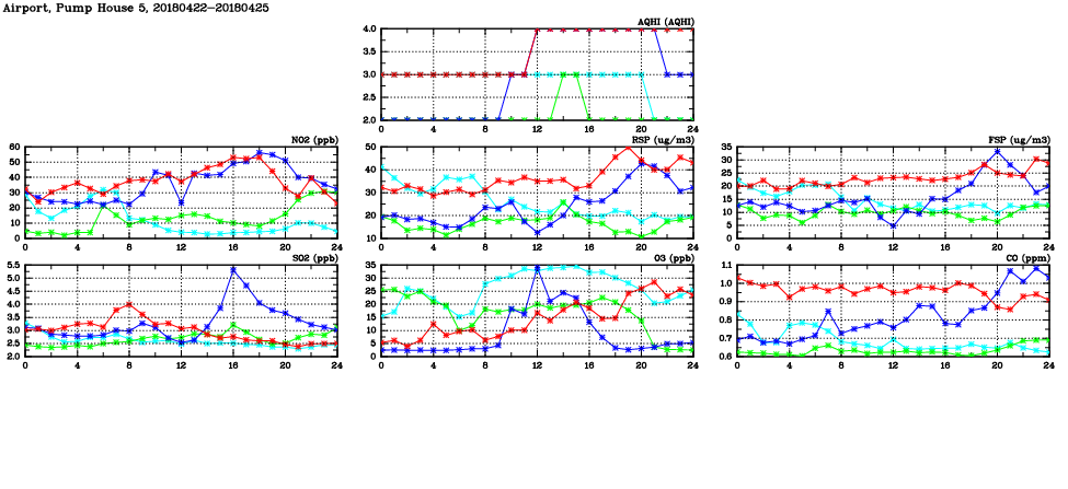 | Air Quality Data Time Series in Airport, Pump House 5 (2018/04/25) | ( Line colors: Day -3 Day -2 Day -1 Current day ) | 2D Map Current AQHI |