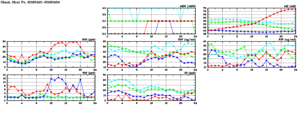 | Air Quality Data Time Series in Sham Shui Po (2018/04/24) | ( Line colors: Day -3 Day -2 Day -1 Current day ) | 2D Map Current AQHI |