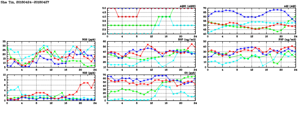 | Air Quality Data Time Series in Sha Tin (2018/04/27) | ( Line colors: Day -3 Day -2 Day -1 Current day ) | 2D Map Current AQHI |