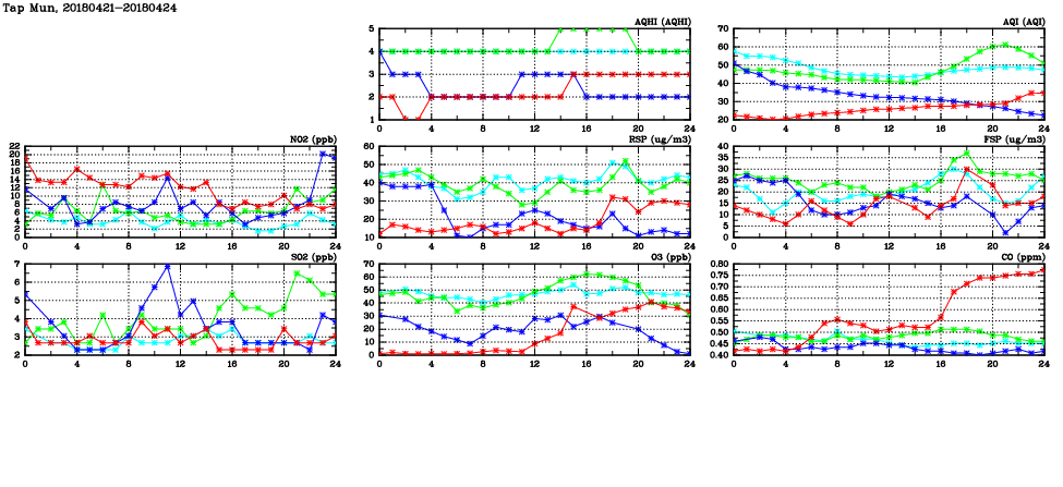 | Air Quality Data Time Series in Tap Mun (2018/04/24) | ( Line colors: Day -3 Day -2 Day -1 Current day ) | 2D Map Current AQHI |