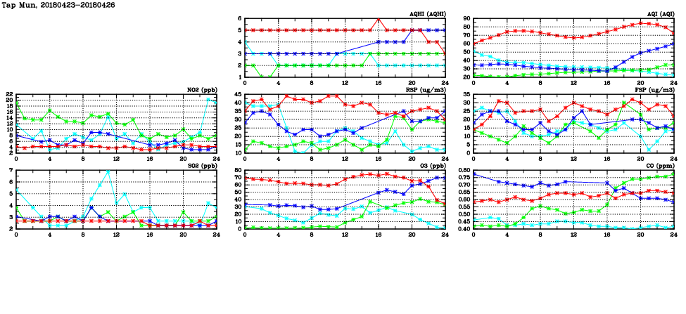 | Air Quality Data Time Series in Tap Mun (2018/04/26) | ( Line colors: Day -3 Day -2 Day -1 Current day ) | 2D Map Current AQHI |