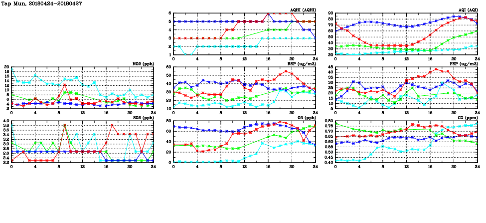 | Air Quality Data Time Series in Tap Mun (2018/04/27) | ( Line colors: Day -3 Day -2 Day -1 Current day ) | 2D Map Current AQHI |