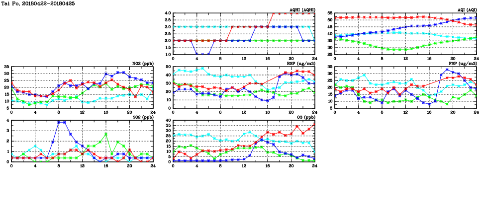 | Air Quality Data Time Series in Tai Po (2018/04/25) | ( Line colors: Day -3 Day -2 Day -1 Current day ) | 2D Map Current AQHI |