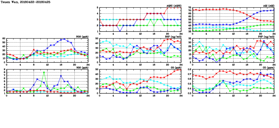 | Air Quality Data Time Series in Tsuen Wan (2018/04/25) | ( Line colors: Day -3 Day -2 Day -1 Current day ) | 2D Map Current AQHI |