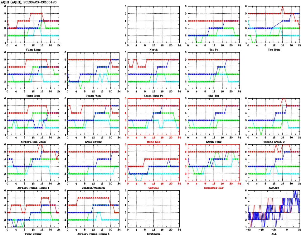 | Air Quality Data Time Series for AQHI (2018/04/26) | ( Line colors: Day -3 Day -2 Day -1 Current day ) | 2D Map Current AQHI |