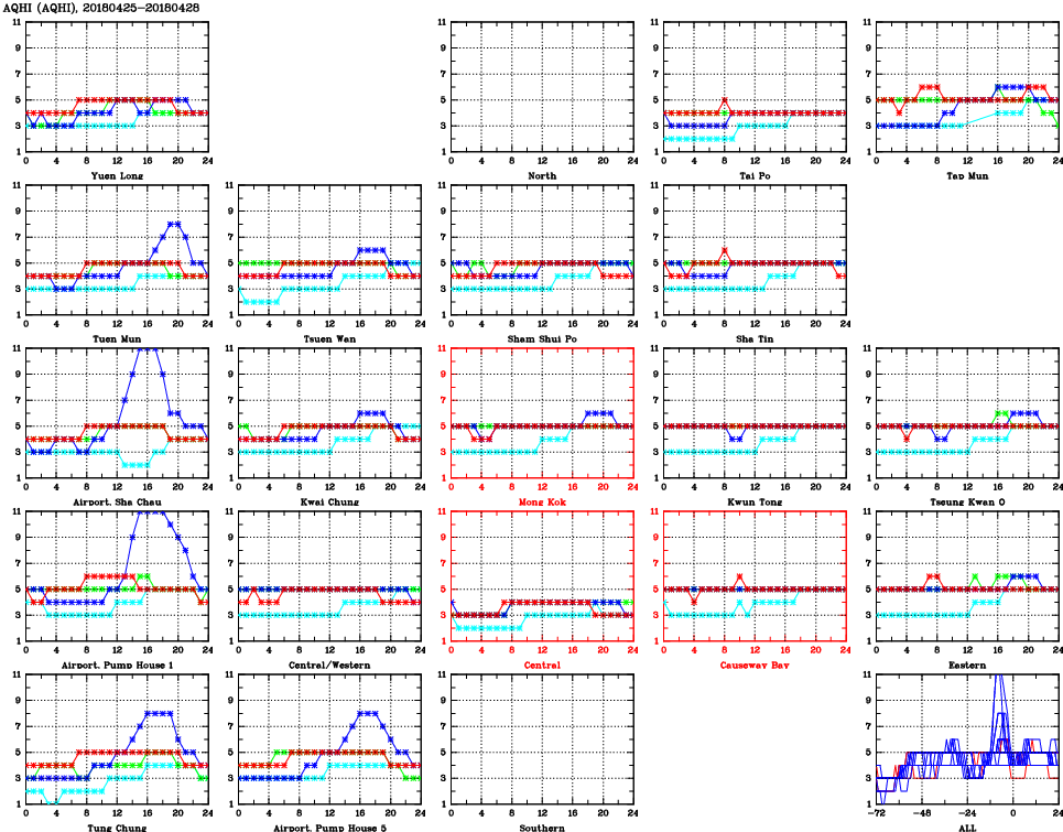 | Air Quality Data Time Series for AQHI (2018/04/28) | ( Line colors: Day -3 Day -2 Day -1 Current day ) | 2D Map Current AQHI |