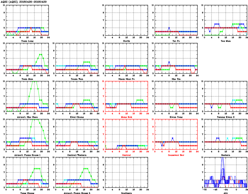 | Air Quality Data Time Series for AQHI (2018/04/29) | ( Line colors: Day -3 Day -2 Day -1 Current day ) | 2D Map Current AQHI |
