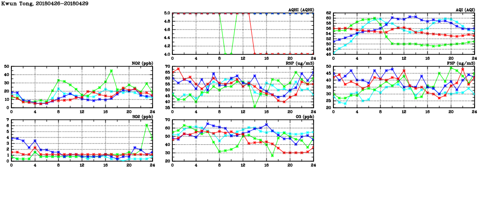 | Air Quality Data Time Series in Kwun Tong (2018/04/29) | ( Line colors: Day -3 Day -2 Day -1 Current day ) | 2D Map Current AQHI |