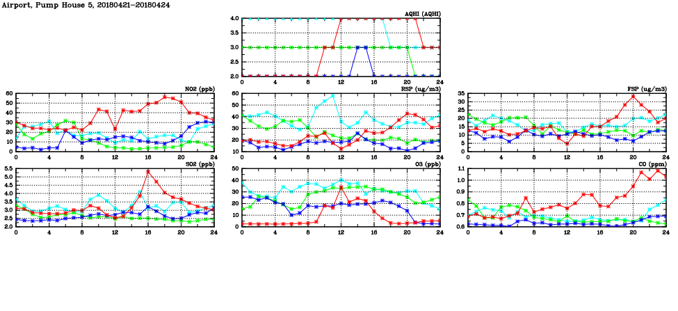 | Air Quality Data Time Series in Airport, Pump House 5 (2018/04/24) | ( Line colors: Day -3 Day -2 Day -1 Current day ) | 2D Map Current AQHI |