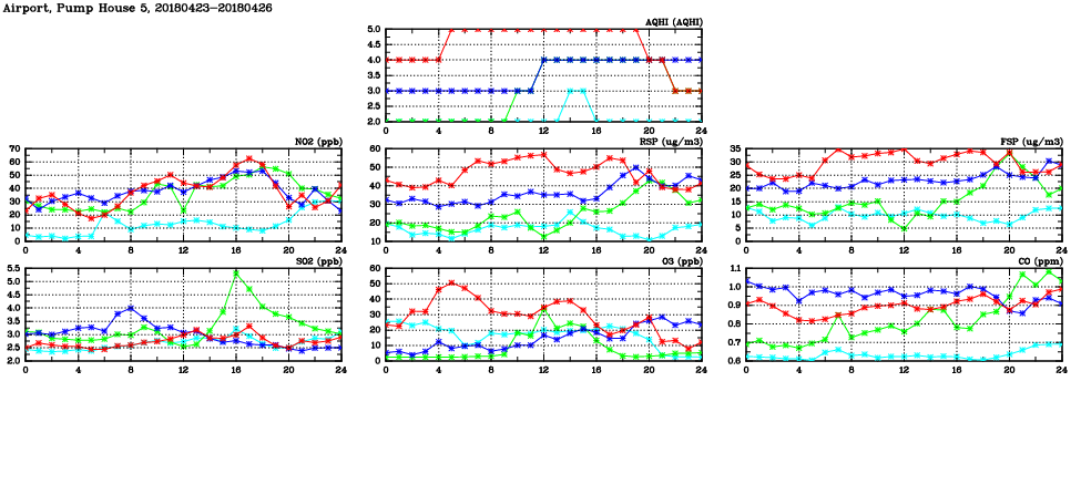 | Air Quality Data Time Series in Airport, Pump House 5 (2018/04/26) | ( Line colors: Day -3 Day -2 Day -1 Current day ) | 2D Map Current AQHI |